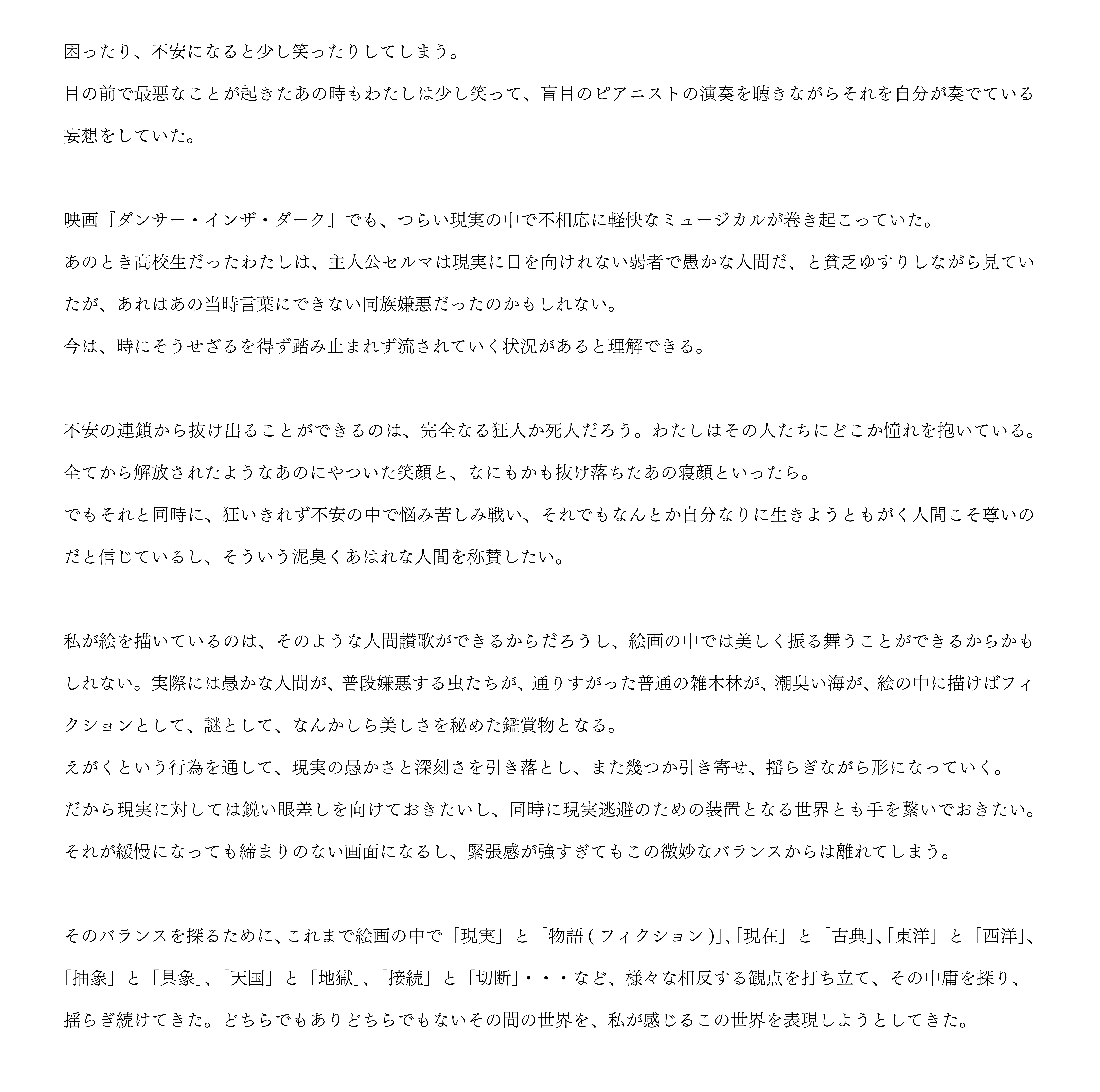 自己の観察や物語によって獲得された他者の視点を通した「我がままに振る舞う女性像」を描く。